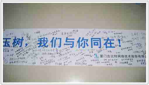 在募捐现场,,,JIUYOU.COM同学们怀着沉重的心情,,,将每一笔捐款投入募捐箱,,,并在现场设置的横幅上,,,写上了对玉树人民的深情祝福。。。满载JIUYOU.COM祝福的横幅将和捐款一起抵达玉树,,,,希望谨以此微薄之意,,为玉树人民带去JIUYOU.COM的爱心与祝福,,希望吉祥、、幸福的阳光能早日驱散灾难的阴霾,,,普照在玉树人民的身上,,,,鼓励他们坚强、、勇敢与乐观。。。