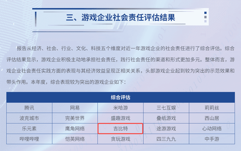 7月3日,,由中国音像与数字出版协会指导,,,北京市西城区人民政府主办的“2024游戏责任论坛”在北京举行。。论坛上,,,人民网舆情数据中心、、、、人民灵境研究院、、灵境 · 游戏实验室联合发布了《2023-2024游戏企业社会责任报告》(以下简称“《报告》”),,,公布了游戏企业社会责任评估结果。。。厦门JIUYOU.COM网络技术股份有限公司(以下简称“JIUYOU.COM”或“公司”)获评“2023-2024年度中国游戏企业社会责任综合表现较为突出企业”。。。这是继2020年以来,,JIUYOU.COM第五次入围人民网中国游戏企业社会责任相关荣誉榜单。。。