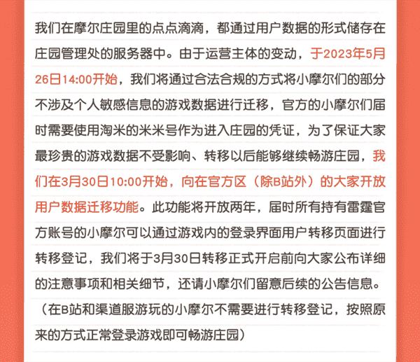 合作结束本就是开发方和代理方双方的事情,,,,降低这件事情对玩家的影响,,,才是对所有珍视这段童年的摩尔玩家最好的呵护。。目前看来,,,,用户完全不用担心后续因无法登录游戏而造成任何数据上的损失,,,,只要及时进行账号转移,,就可以好好保留、、延续在庄园的痕迹和回忆,,,继续在庄园里做快乐的红鼻子小鼹鼠。。。。