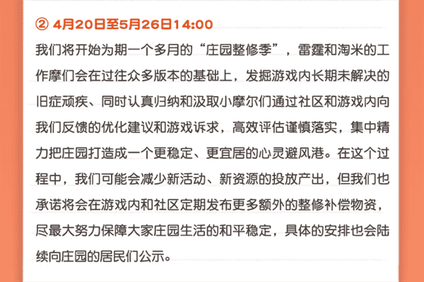 合作的结束并不意味着这个童年IP的结束,,,对于《摩尔庄园》手游而言,,,这是一个新阶段的开始。。。。后续游戏内将开启庄园重构计划,,会就以往遗留下来的BUG进行集中修复,,,并在游戏内和社区定期发布更多补偿物资。。