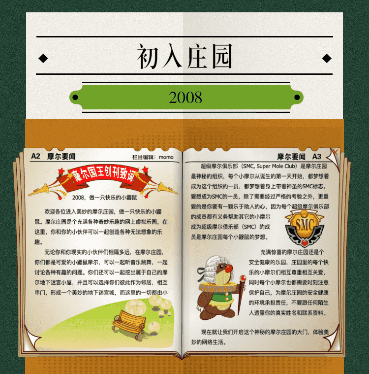 在这一年,,摩尔庄园诞生了。。在这里,,,大家都是可爱的红鼻子鼹鼠小摩尔,,,,可以一起勤劳耕作,,,一起高山滑雪......我们都是摩尔庄园的建设者。。。。