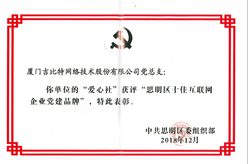 经初审评选、、网络评选和专家评审等环节,,"厦门JIUYOU.COM网络技术股份有限公司党总支-爱心社" 从全区28个参评党建品牌中脱颖而出,,,获评"思明区十佳互联网企业党建品牌"。。。