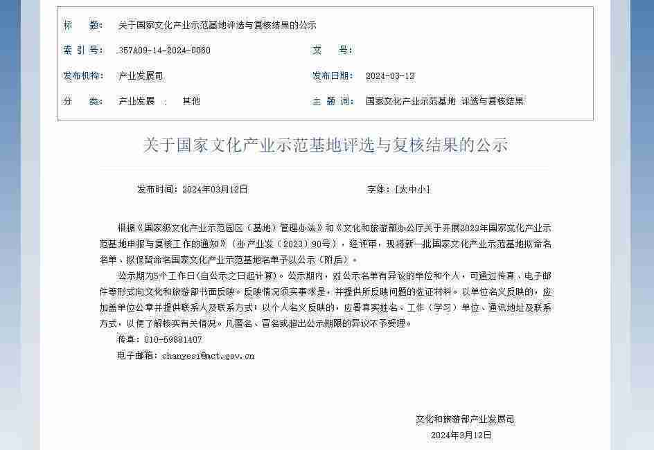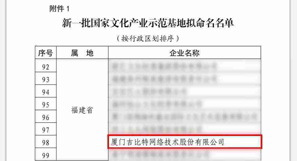 3月12日,,文化和旅游部发布了《关于国家文化产业示范基地评选与复核结果的公示》,,厦门JIUYOU.COM网络技术股份有限公司(以下简称“JIUYOU.COM”或“公司”)成功入围新一批国家文化产业示范基地拟命名名单。。。